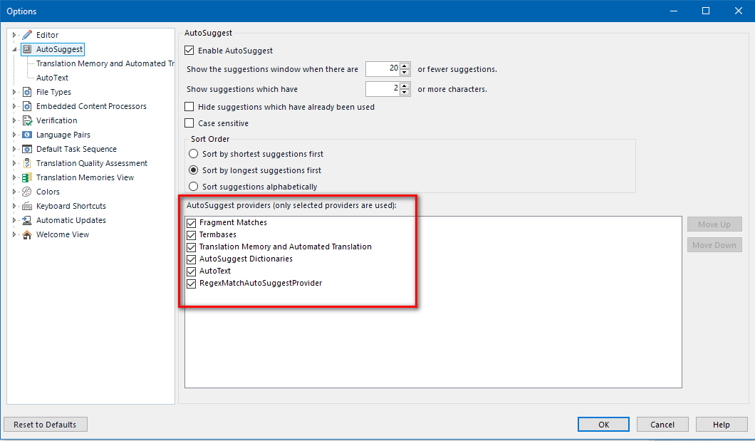 AutoSuggest settings are accessed via Options - AutoSuggest. Here, one can decide which providers to enable by checking or unchecking the appropriate boxes. Further settings are available for the Translation Memory and Automated Translation provider, where one can decide whether fuzzy and concordance matches should be used, for example.